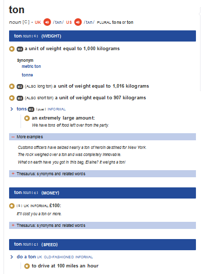 A Norwegian proverb says that a much-loved child has many names. Not only do we have many names when it comes to the abovementioned ton, we actually have many children as well! The picture shows what Cambridge Dictionary says when we search for "ton".