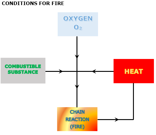 As you hopefully remember, a fire needs three elements to ignite: oxygen, heat and a combustible substance, a fuel. We have often seen these three elements in the fire triangle over the years. The later years, a fourth element has been added to basic fire theory, namely a chemical chain reaction. Simply put, the chain reaction is what happens when oxygen, heat and a fuel become a fire. This is shown in the in the figure you see below.