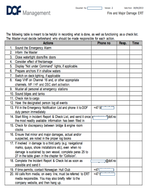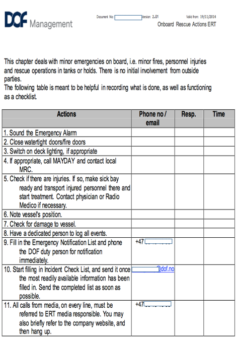 In the following, you will see three different examples of procedures. The first, figure 15, is an example of a procedure for fire and major damage. The second, figure 16, is a procedure example for onboard rescue actions, like minor fires, personell injuries and rescue operations in tanks or holds. Both of these procedures are examples from the Norwegian shipping company DOF. The last one is a more generic example of a fire procedure.