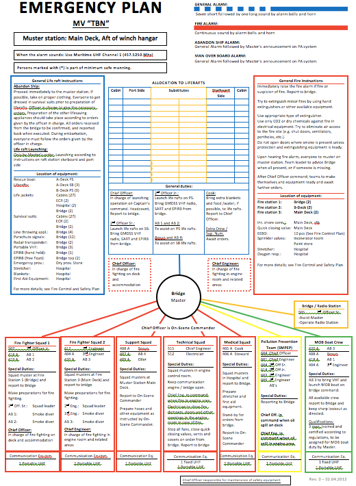 The muster list mentioned in §3.4.2.1 and §3.5.2.1 shows the procedures and duties of all personnel in an emergency situation. The list should be displayed in prominent areas of the vessel to ensure that it is made available for every member of the crew. Muster lists are often found on the bridge, in the engine room, the accommodation, the galley, and alleyways. An example of an emergency plan or muster list can be seen below.