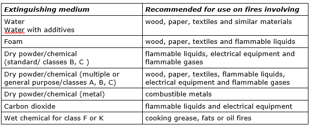 - about classes of fire and different fire fighting systems