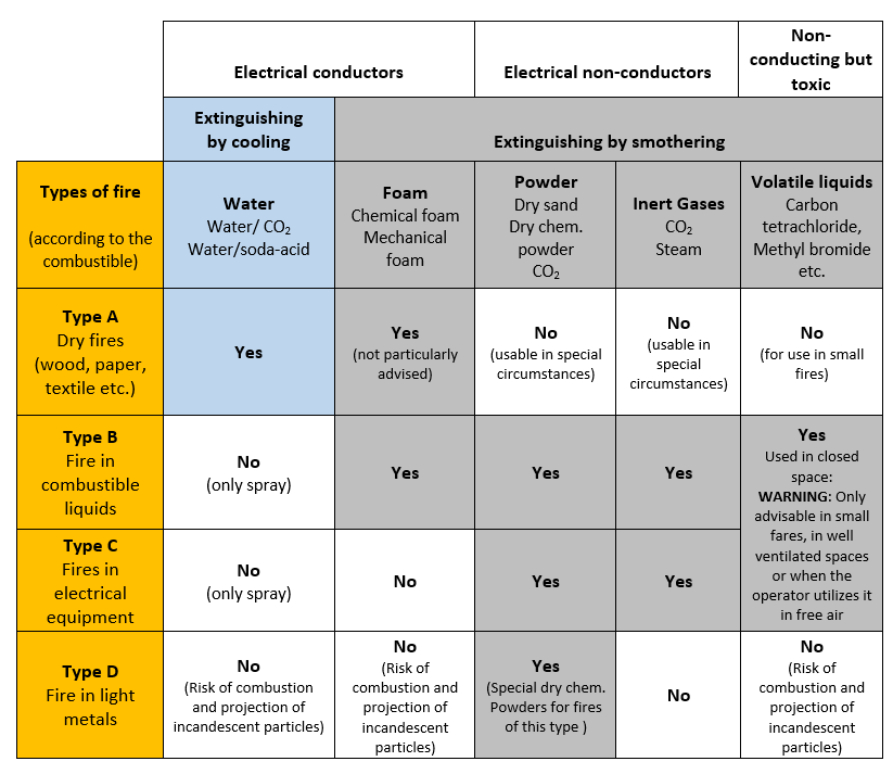 It is crucial to have knowledge of the different types of fire and the kinds of equipment best suited to fight these different types. Extinguishing agents differ based on the kind of fuel or substance that is involved. An extinguishing agent that proves effective on one type of fire could be dangerous when used to fight another kind of fire. A rough description of the classes are given in the following.