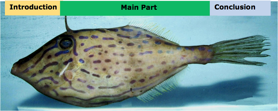 A formal text should be structured into three main parts, as shown on the picture of the fish. We start at the head with a short introduction, move on to the body, and conclude at the tail of the fish. As you can see, the introduction and the conclusion are smaller parts of the text. The content is taking up more space and requires the body of the fish/text to have enough room to be debated, explained, and/or presented sufficiently.